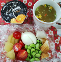 大豆ミートのナゲット、きゅうりの浅漬け、レタス中心の残った野菜や竹輪のサラダ、目玉焼き