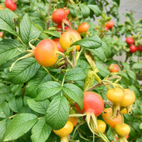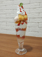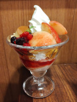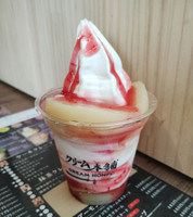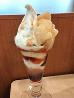 缶詰の桃だろうけど、ソフトクリームに桃と苺ソース