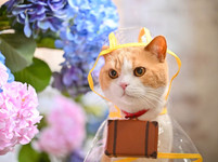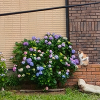 午後何気に外を見たら、紫陽花の横に三毛にゃん
