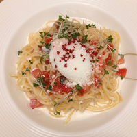 パスタは冷製梅とトマトのカルボナーラ