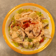 夕飯は冷凍餃子とレタスサラダチキンゆで卵サラダ