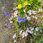 落ちた花びらとタンポポと紫のはムスカリ