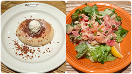 サーモンアボカドマヨポキボールのハーフとホイップバターパンケーキのハーフ